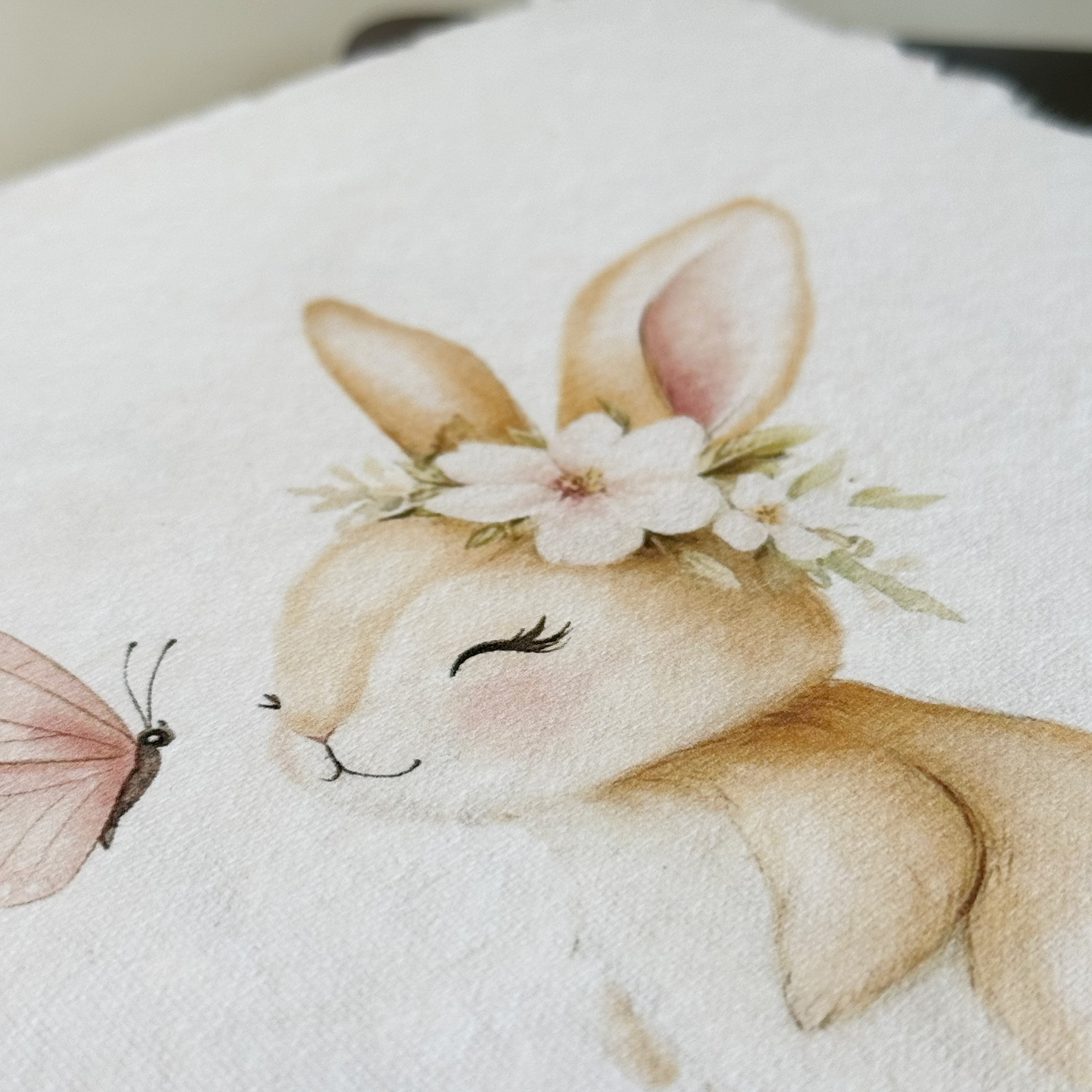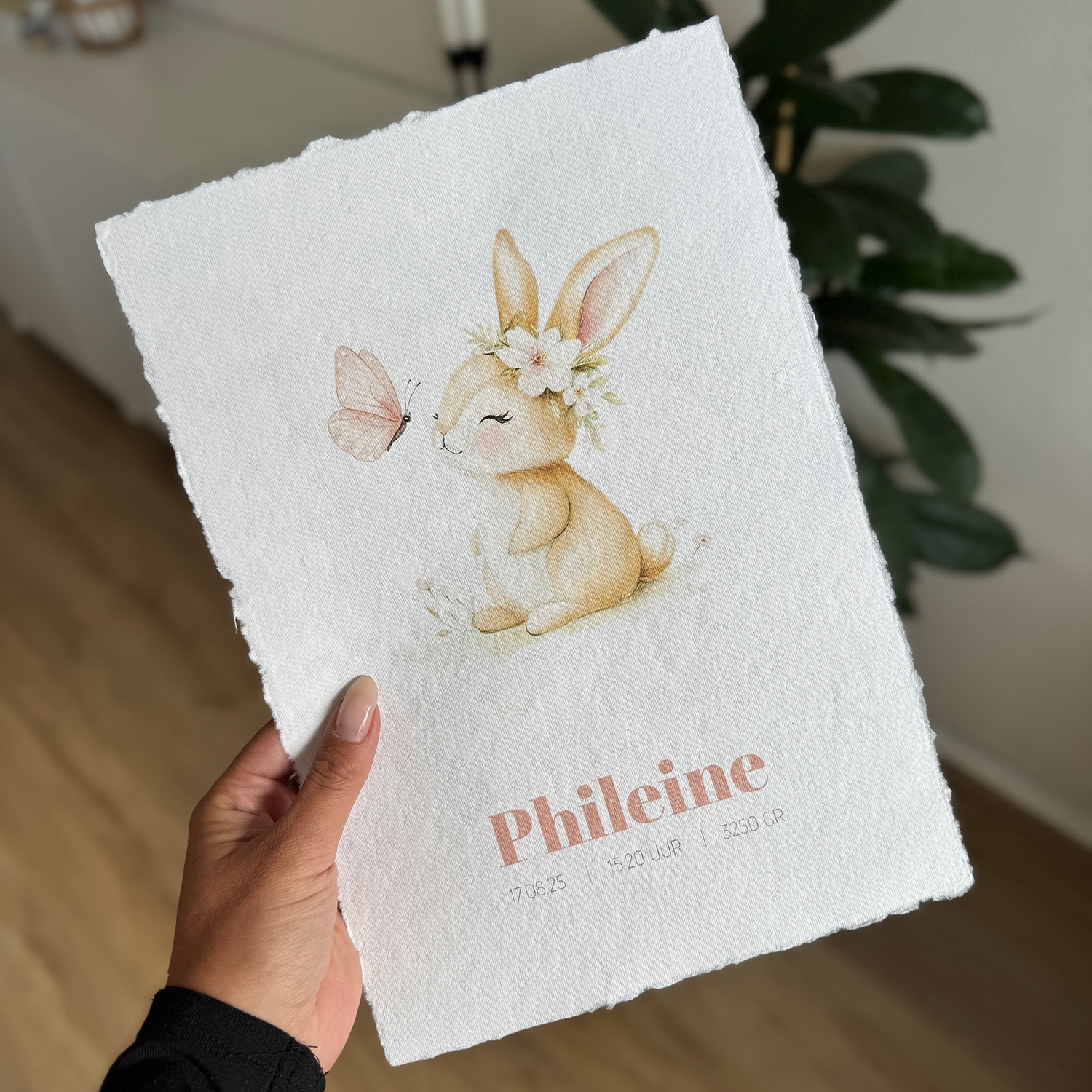 Gepersonaliseerde geboorteposter met illustratie van een konijn met vlinder, naam en geboortegegevens. Keuze uit vier luxe papiersoorten.