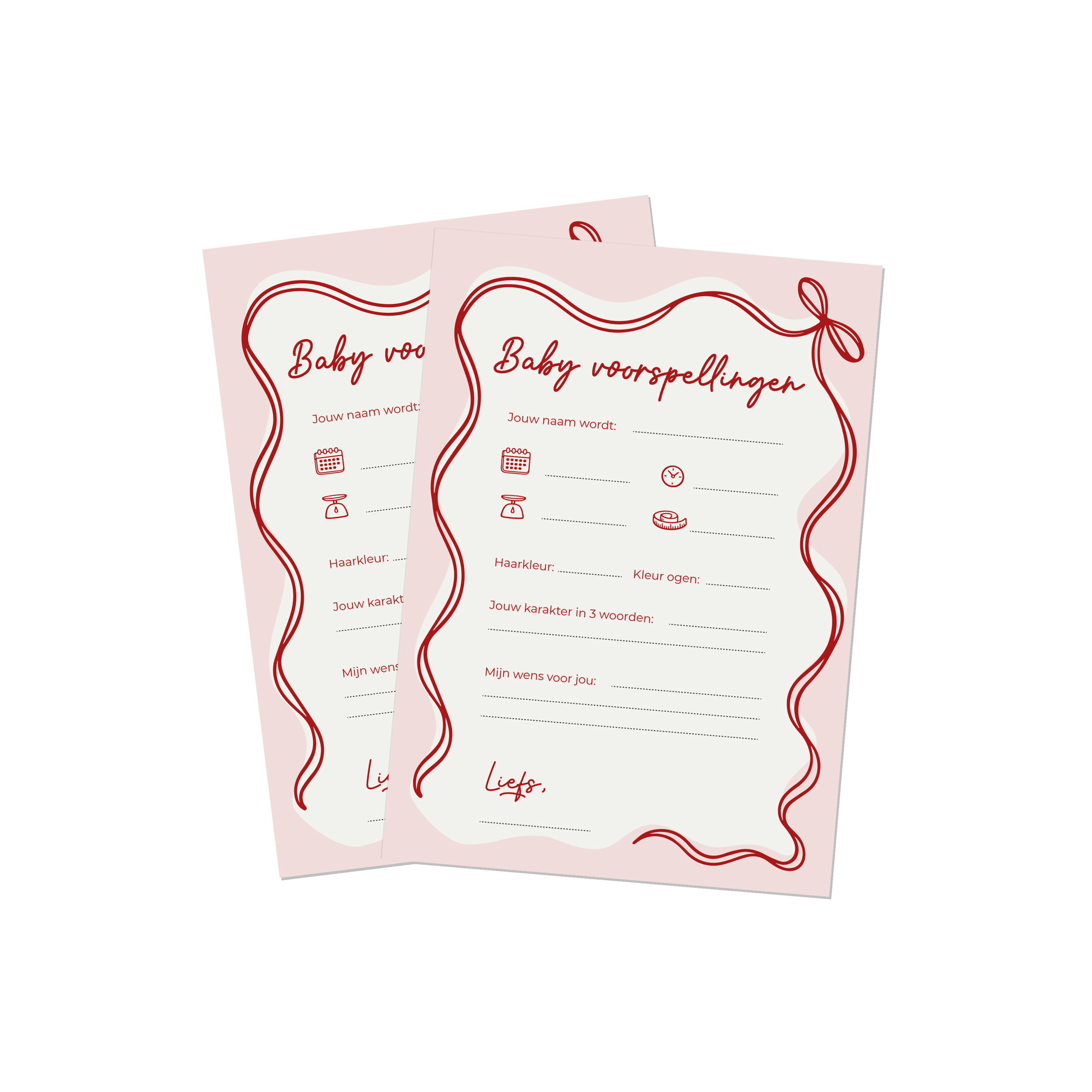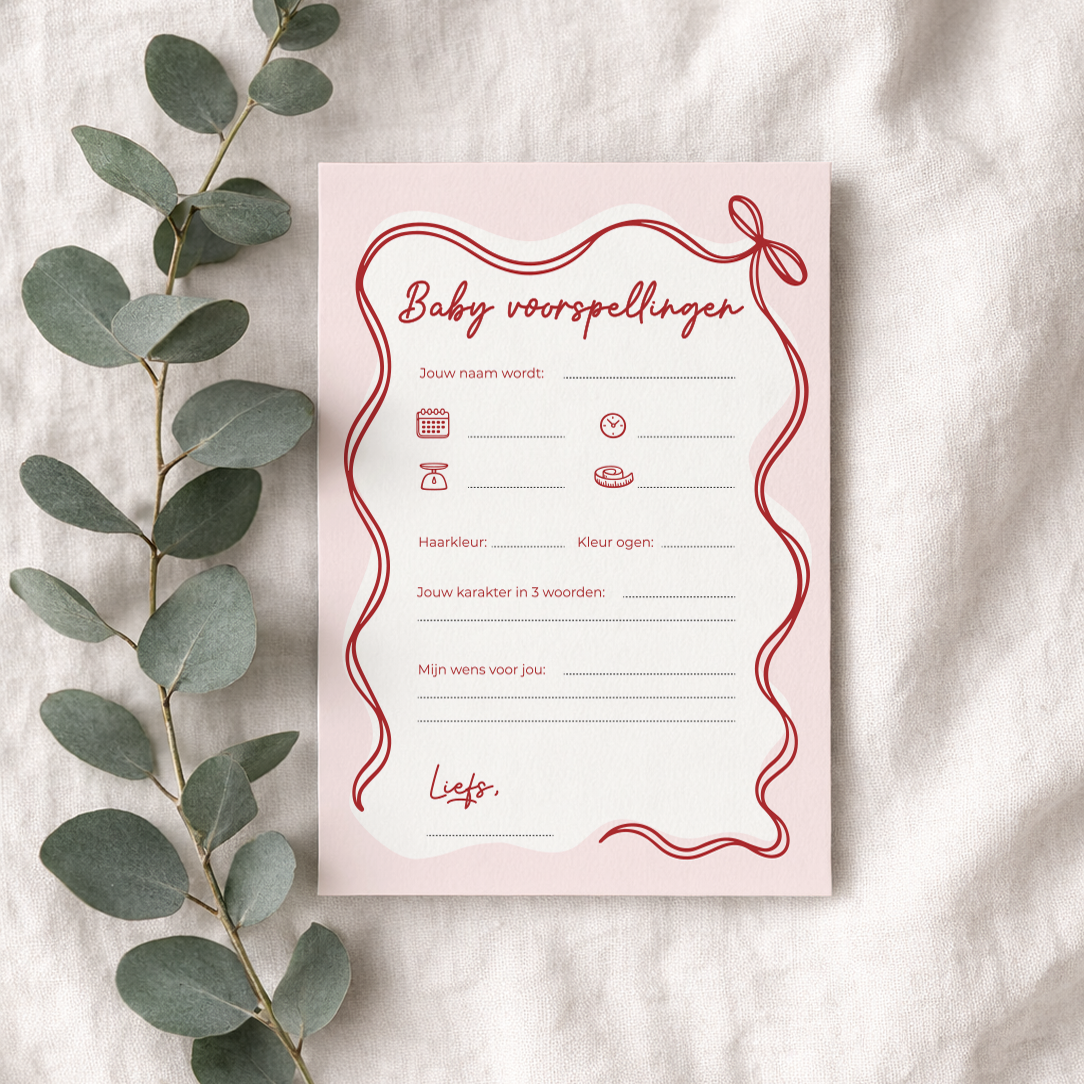 Maak de babyshower extra leuk met deze stijlvolle baby voorspellingen invulkaart. Gasten kunnen hun voorspellingen opschrijven over de baby, zoals geboortedatum, gewicht, haarkleur en karakter. Ook is er ruimte om een persoonlijke wens voor de baby te schrijven. In een set zitten 5 invulkaarten in A6 formaat, gedrukt op extra stevig 350 grams papier.